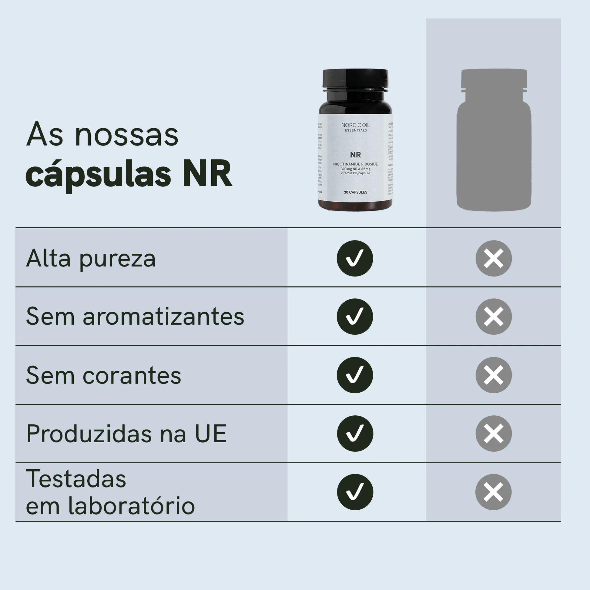 As Cápsulas de Ribosídeo de Nicotinamida (NR) da Nordic Oil fornecem 300 mg de NR e 32 mg de Vitamina B3 por cápsula, oferecendo uma abordagem limpa e inspirada na investigação para a vitalidade diária.