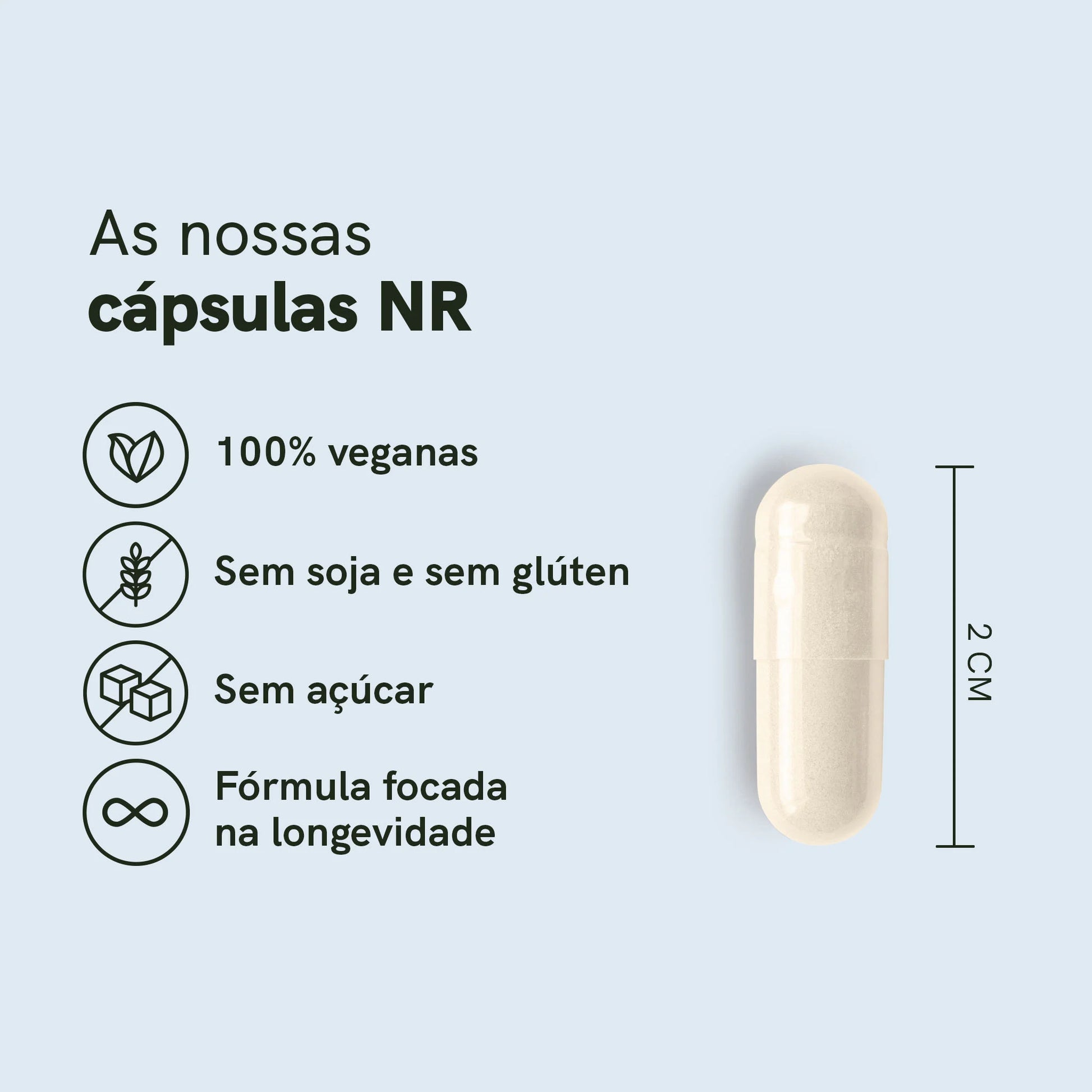 - Fórmula de alta concentração: 300 mg NR + 32 mg Vitamina B3 por cápsula