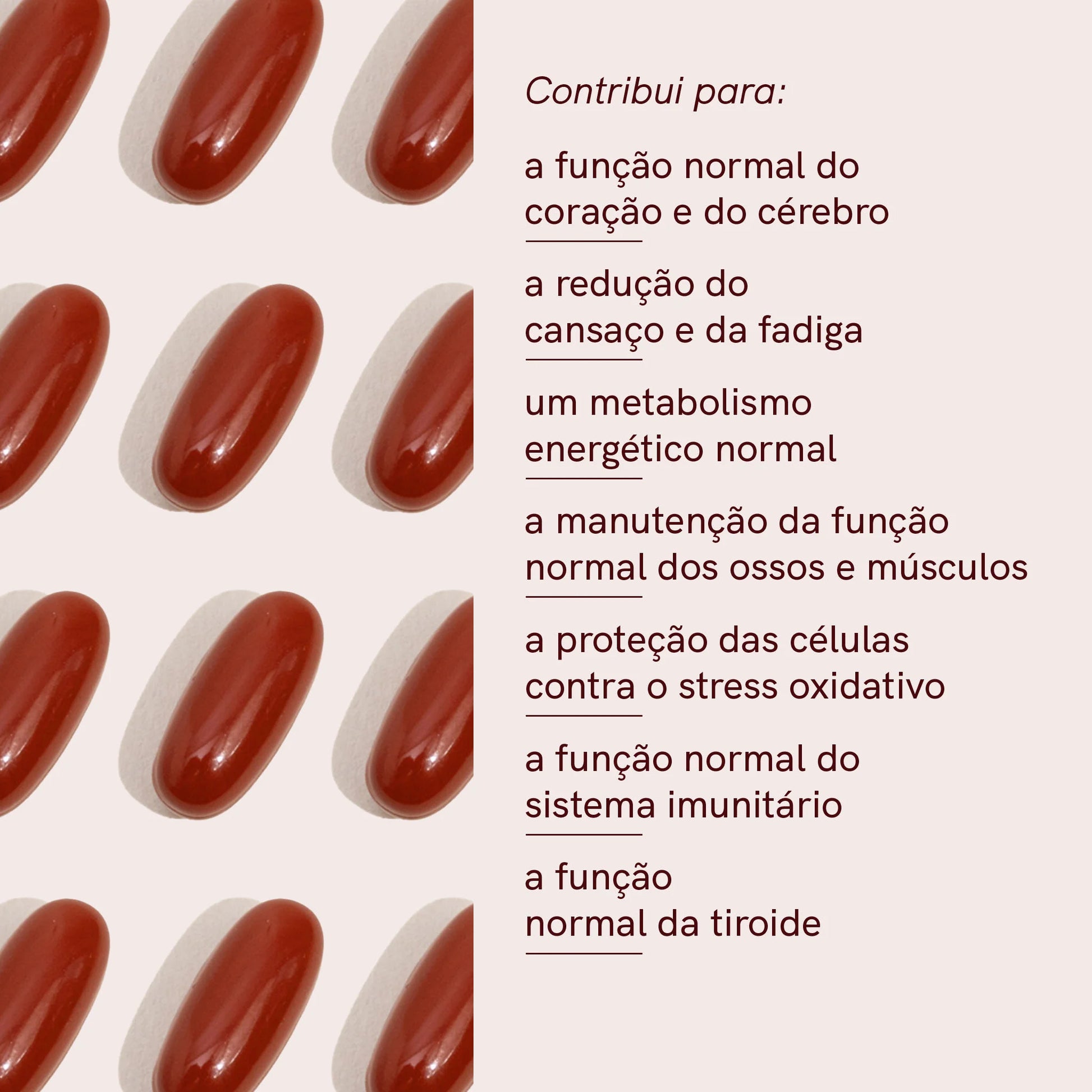 Cápsula de gel: Gelatina (bovina), glicerina, água, sorbitol, corante: óxido de ferro vermelho (E172).