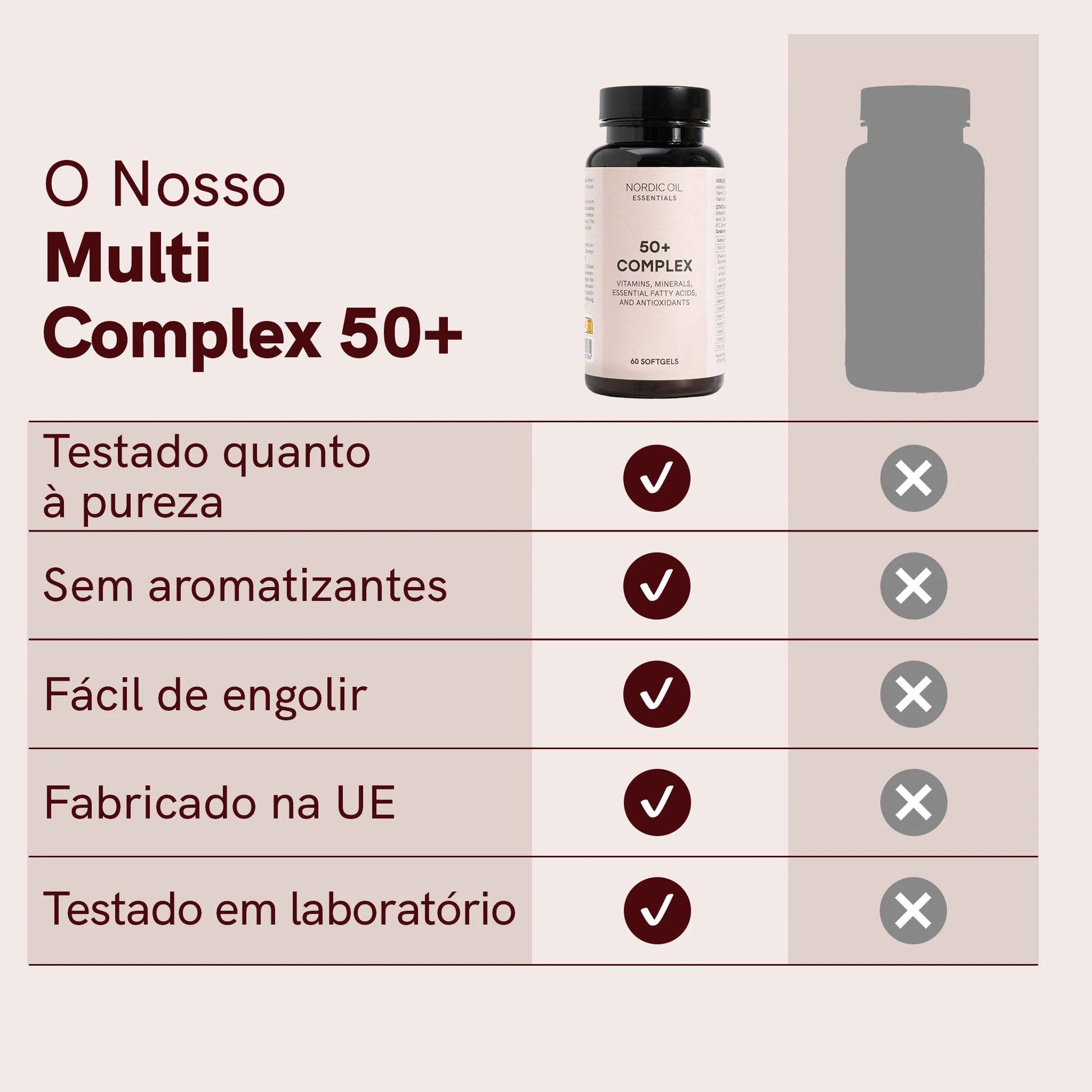 O Multi Complex 50+ vai além de um suplemento multivitamínico típico. Ele contém não apenas uma ampla gama de vitaminas e minerais, mas também ácidos graxos ômega-3 (DHA e EPA), raramente encontrados em preparações comuns. Ele também é adaptado às necessidades de adultos com mais de 50 anos, sendo mais adequado à idade do que os multivitamínicos tradicionais.