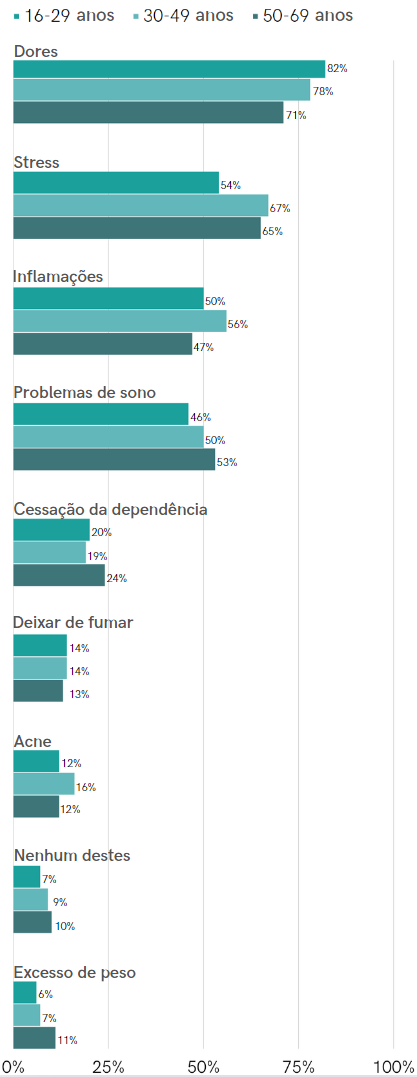 No período de inquérito entre 15 e 20 de julho de 2020, um inquérito publicado pela Statista investigou as áreas de aplicação do CBD. 1.000 inquiridos responderam online em que áreas de aplicação poderiam imaginar o canabidiol (CBD) a ser medicamente eficaz. Os inquiridos também indicaram a sua idade para que os resultados pudessem ser divididos em três grupos etários. Em todos os grupos etários, a aplicação no domínio da “dor” foi mencionada com mais frequência. Os participantes mais velhos do inquérito, em particular, vêem aqui potencial. Mais de 8 em cada 10 pessoas com mais de 50 anos vêem o CBD como uma ajuda para a dor.